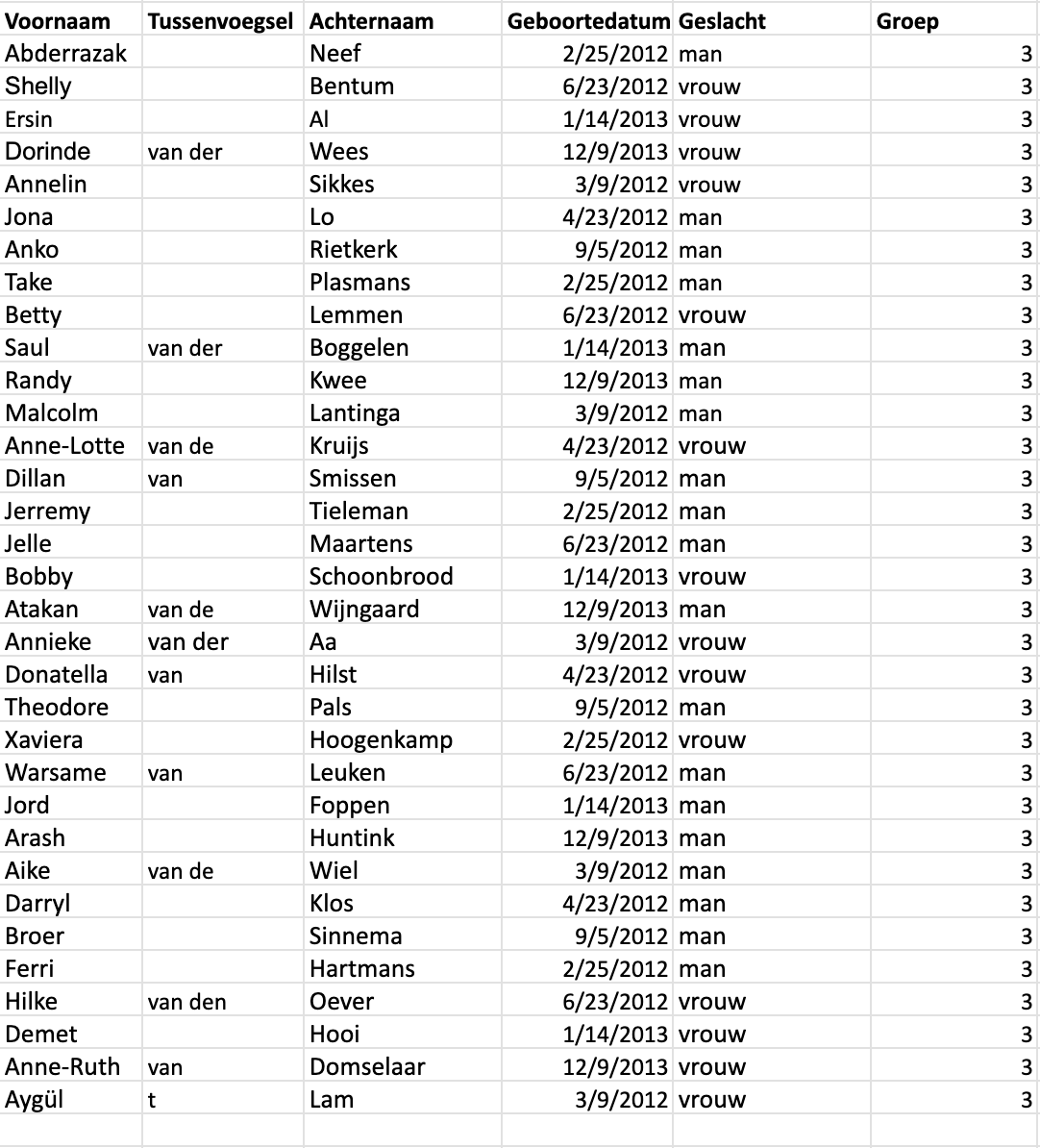 Let op: Geboortedatum moet dit formaat hebben om juist te worden herkend.Geslacht (verplicht - format: M/V, m/v, Man/Vrouw, man/vrouw)